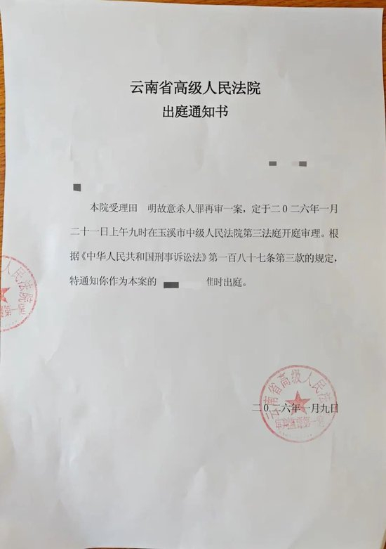 此前,玉溪市中级人民法院一审以故意杀人罪判处田某明死刑,缓期二年执行,剥夺政治权利终身。田某明不服,提出上诉。云南省高级人民法院二审裁定驳回上诉、维持原判,并核准田某明死刑,缓期二年执行,剥夺政治权利终身。